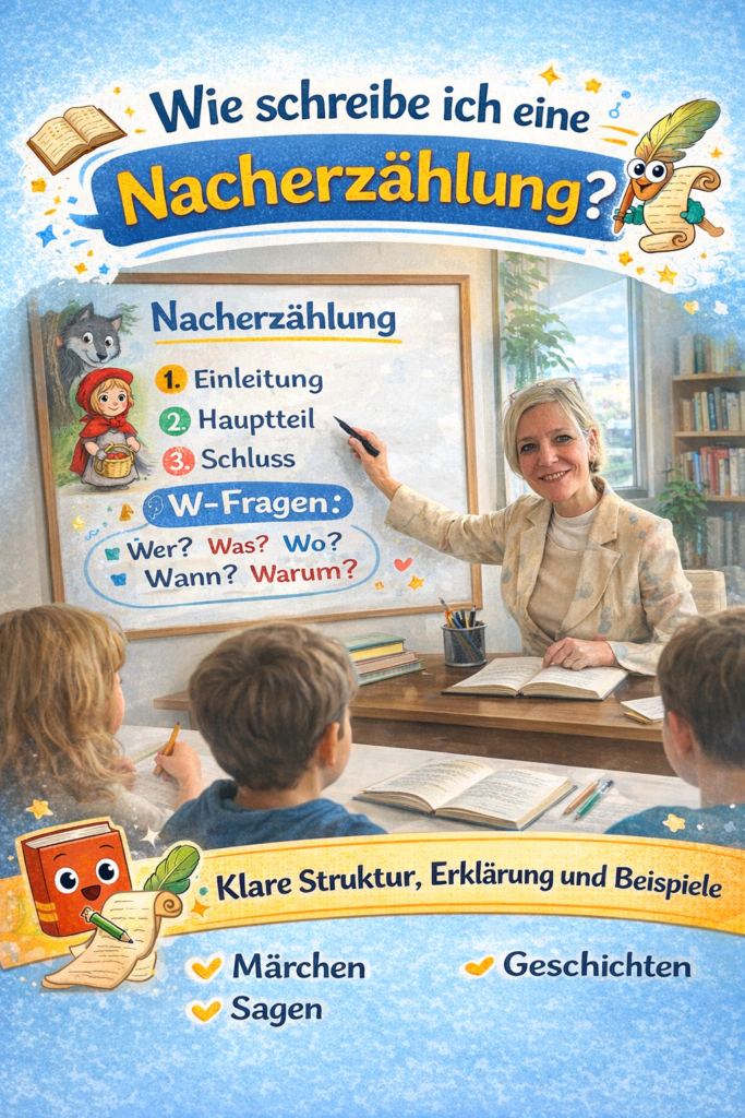 Die Nacherzählung ist eine wichtige Schreibform im Deutschunterricht. Dabei erzählt man eine Geschichte mit eigenen Worten noch einmal, ohne neue Inhalte hinzuzufügen. Ziel ist es, den Inhalt eines Textes klar, vollständig und in richtiger Reihenfolge wiederzugeben.